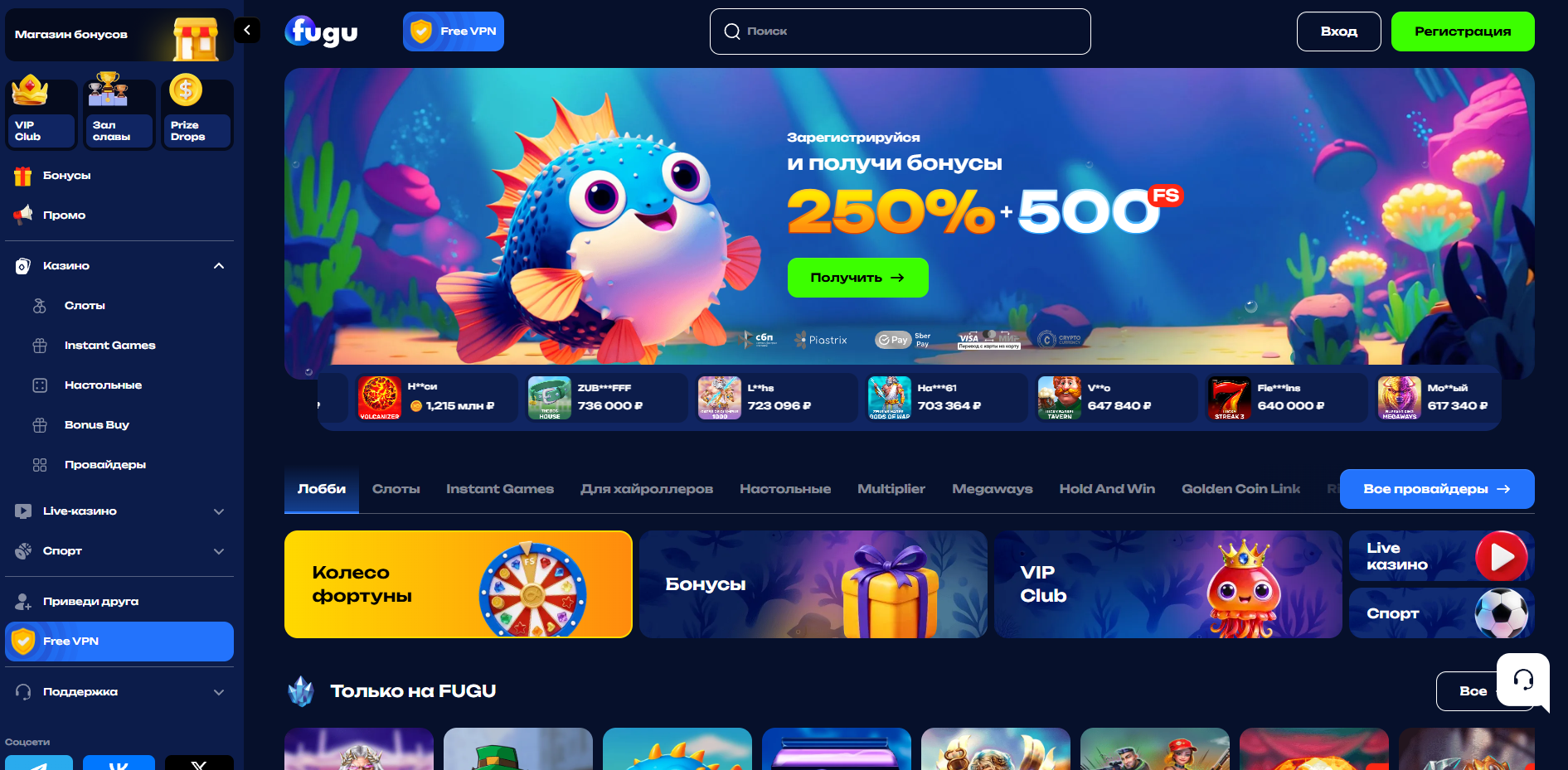 Игровая библиотека Fugu Casino насчитывает более пяти тысяч наименований от признанных мировых разработчиков. Участники получают доступ к самым популярным и новейшим слотам, настольным играм, видеопокеру и живым дилерам. Каждая категория представлена широким выбором тематик и механик, удовлетворяющих предпочтения самой требовательной аудитории.